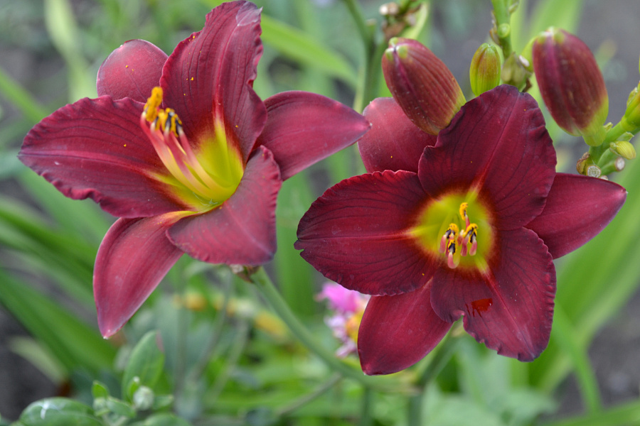 Окраска цветка : темно-бордовый с зеленым горлом,повторное цветение