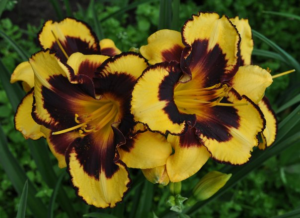 • Окраска цветка : Лимонно-жёлтая с тёмно-бордовыми, почти чёрными пятном и тонким кантом